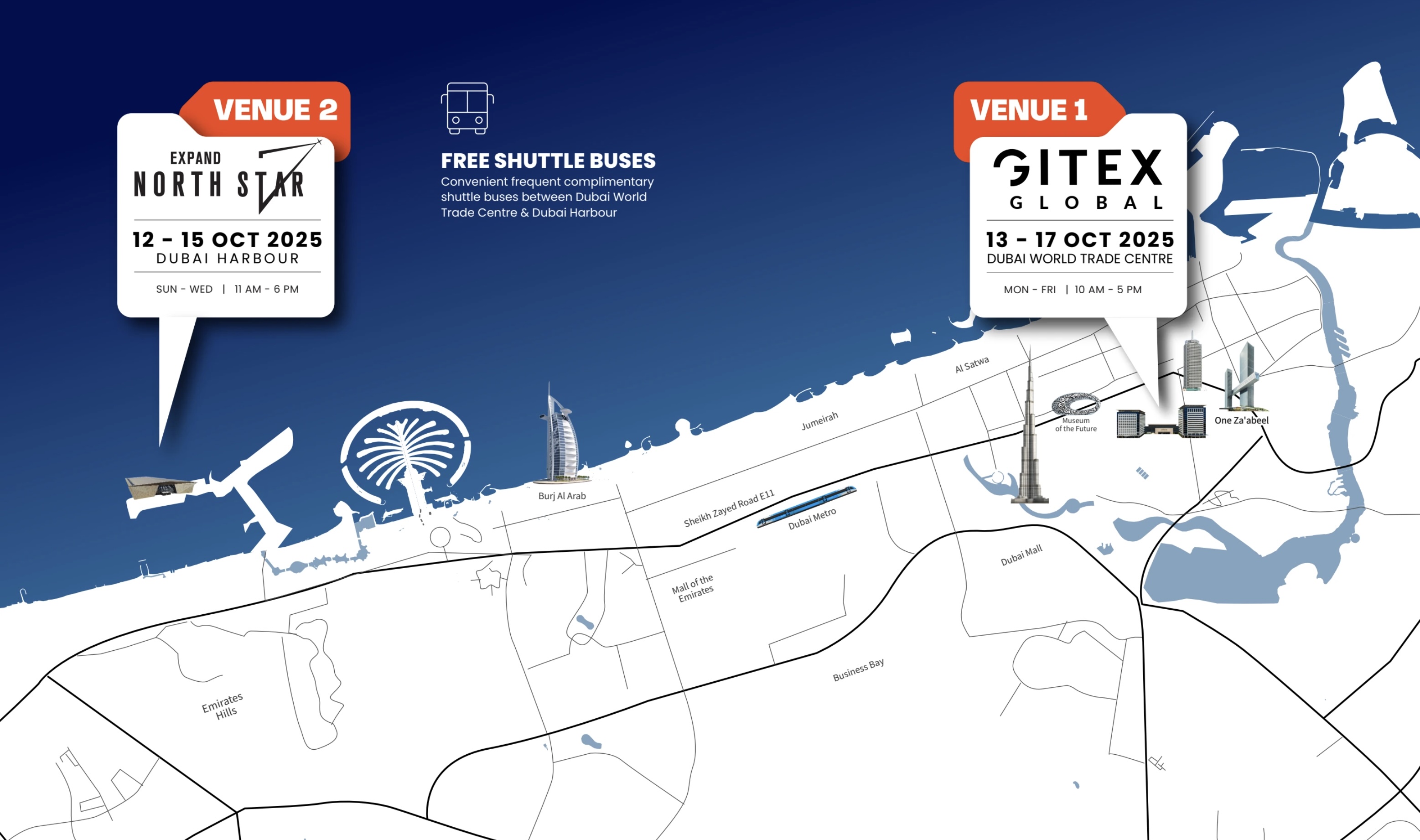 교통: 두바이 월드 트레이드센터 전시장에서 출발하는 무료 셔틀버스로 행사장을 오가실 수 있습니다.